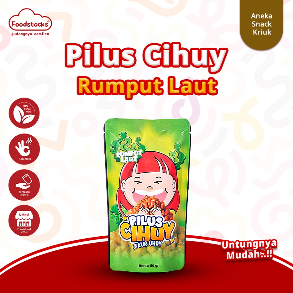 Cekelin - Pilus Cihuy Cikur Rasa Rumput Laut merupakan camilan pilus renyah dengan kombinasi unik antara rempah cikur (kencur) dan bumbu rumput laut yang gurih. Hadir dalam kemasan 50 gram yang praktis, cocok sebagai teman santai atau cemilan harian.