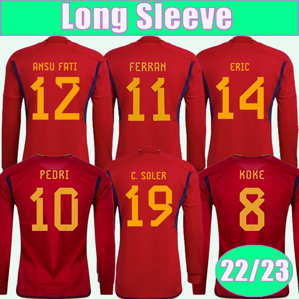 22 23 pedri long sleeves mens soccer jerseys koke gavi ferran sergio rodrigo national team home football shirts uniforms, Black;yellow