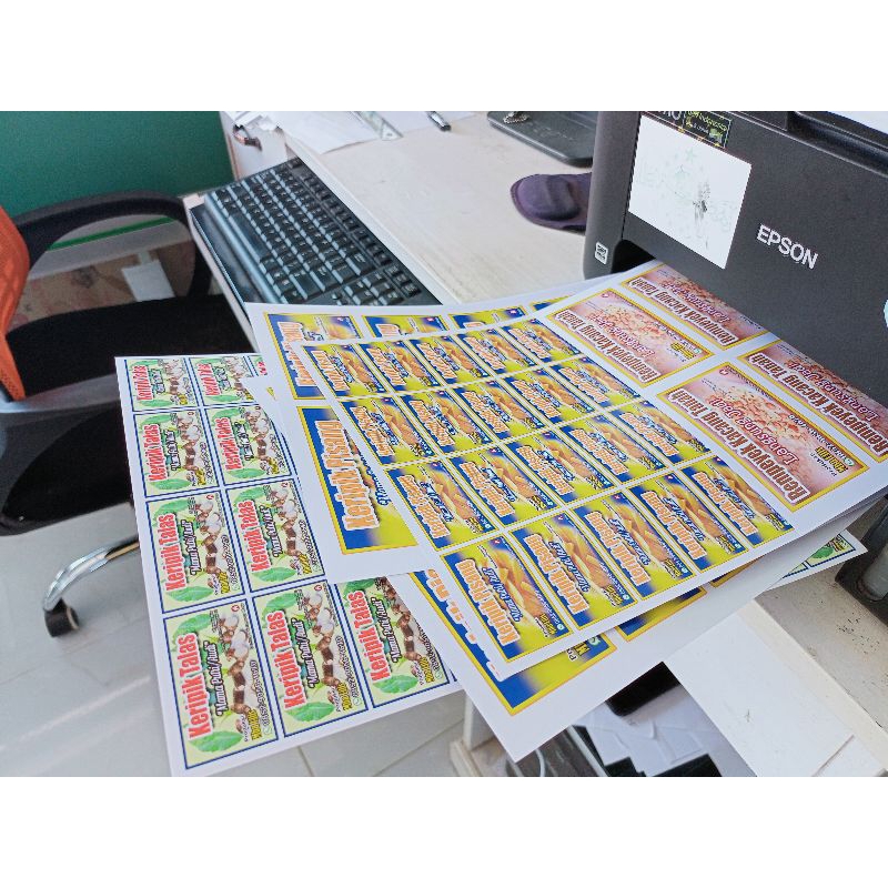 Sticker product berbahan dasar kertas sticker foto (glossy) yang diprint dengan printer foto rumahan bertinta ori,
