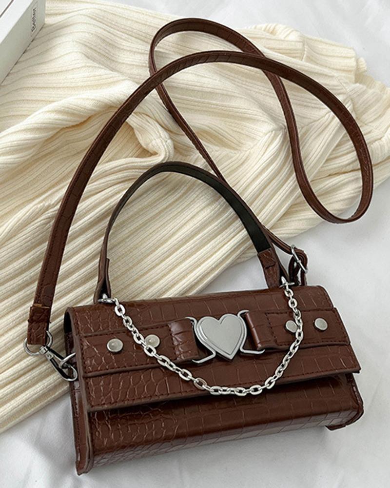 Chain Decor Heart Belted Rectangular Satchel Bag, Coffee