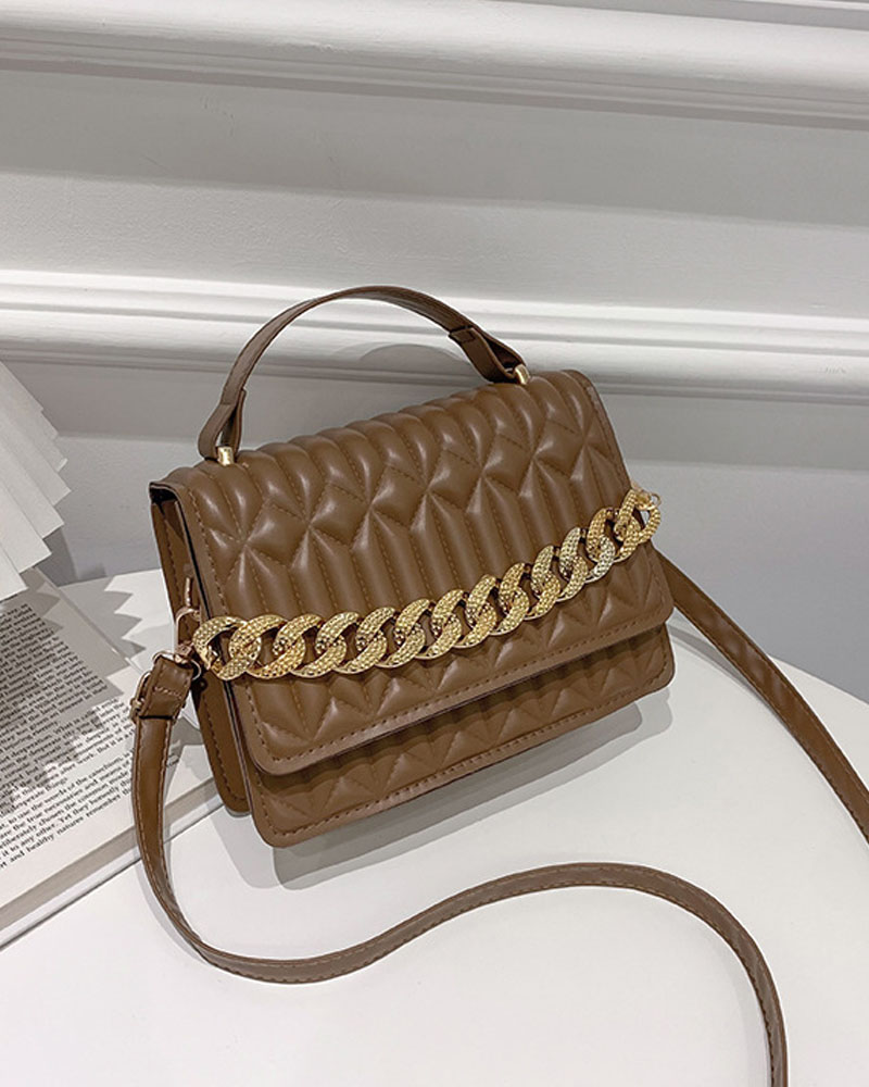 Chain Decor Quilted Flap Shoulder Bag With Handle, Coffee
