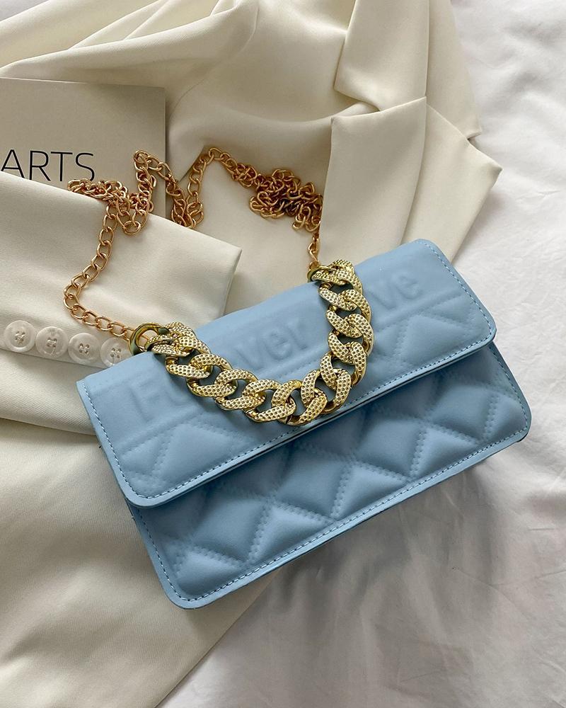 Chain Decor Quilted Letter Pattern Shoulder Bag, Blue