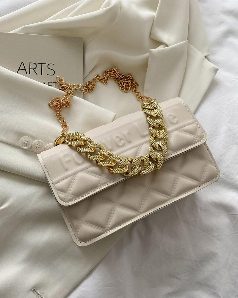 Chain Decor Quilted Letter Pattern Shoulder Bag, White