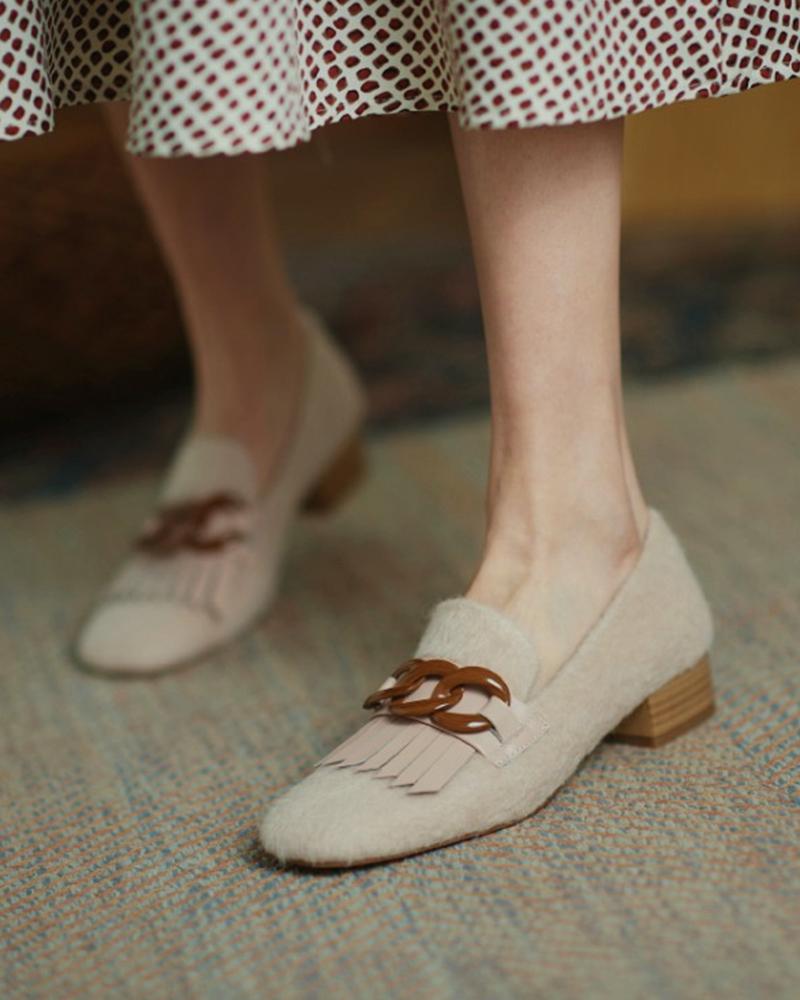 Chain Design Tassel Fluffy Chunky Loafers, Beige