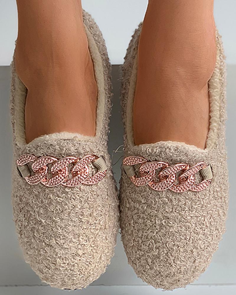 Chain Pattern Decor Fluffy Shoes, Khaki
