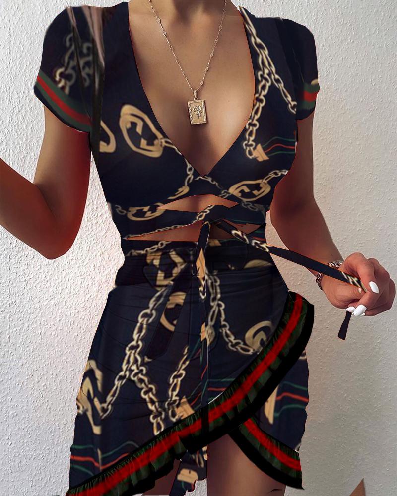 Chain Print Cutout Ruffles Ruched Dress, Dark blue