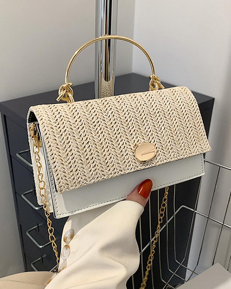 Chain Strap Straw Flap Shoulder Bag With Handle, White