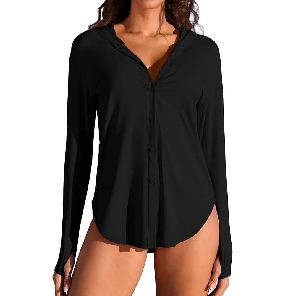 Charmleaks Женская Rash Guard UPF 50+ Защита от солнца Одежда на пуговицах SPF Толстовка с капюшоном Пляжные рубашки XL чёрный