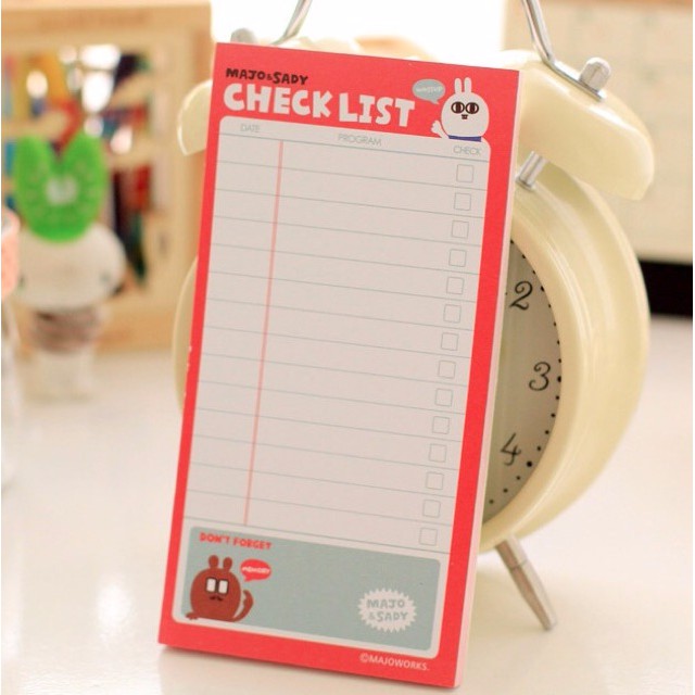 PRODUK BARU! "To do List/ Checklist" Majo n Sady ini hadir dengan isi 50 lembar, ukuran 14 x 7 cm, memudahkan anda dalam menyelesaikan pekerjaan anda setiap hari! harganya murah dan membawa kepraktisan untuk anda! Bisa membantu anak anda untuk manajemen waktu juga!