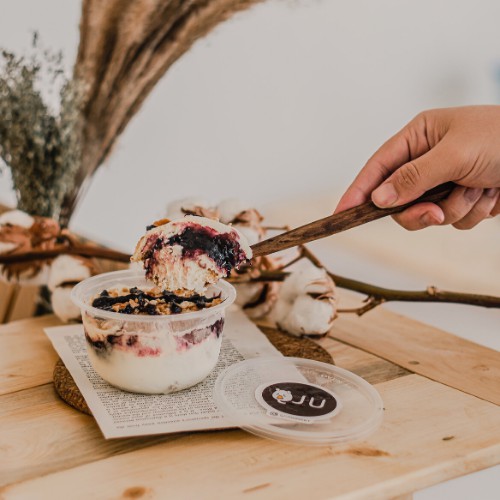 QJU merupakan cream cheese dessert yang dipadukan dengan biskuit ditambah dengan berbagai topping di atasnya. Qju dibuat homemade tanpa bahan pengawet.