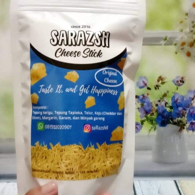 Cheese Stick SARAZSH cemilan yang gurih dan nikmat. Taste it, and get happiness. Cheese Stick/Stick Keju dengan rasa dan kualitas kekinian, dibuat dengan tepung, keju cheddar kraft, keju edam ayam emas, Non msg, dan dikemas dengan standing pouch sehingga praktis dibawa kemanapun tanpa khawatir tumpah.