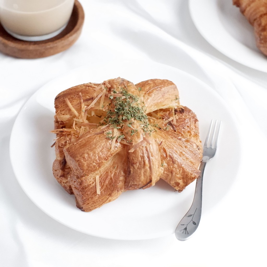 Pastry crunchy dengan isian keju parut dan parsley sebagai topping.