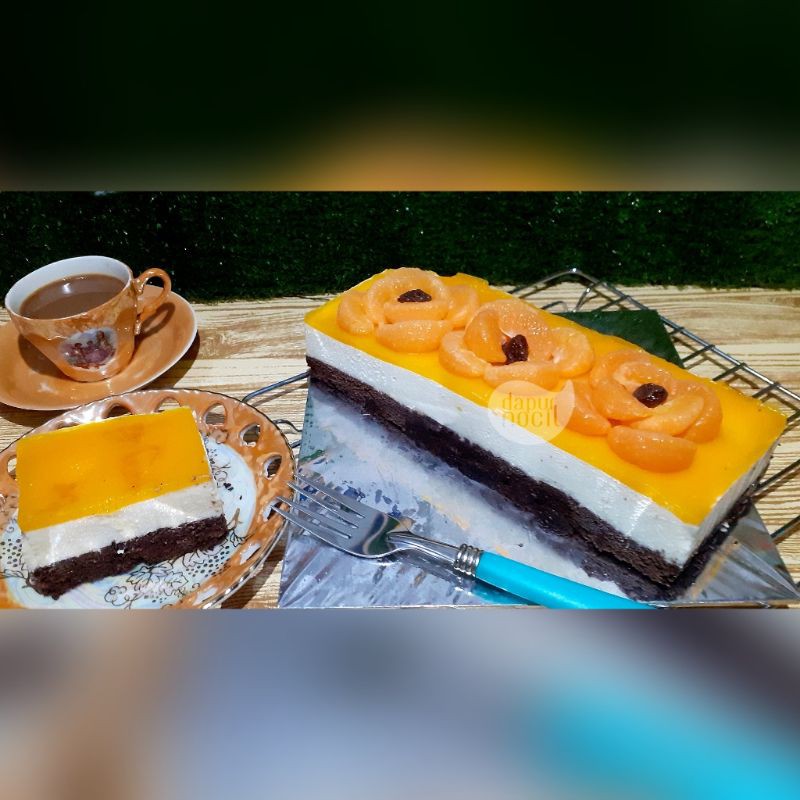 Cheese cake mango home made Dapur Nocil (halal). Para pecinta cheese & mango pasti suka banget sama cake yg satu ini. Dengan perpaduan cream cheese & mangonya yg segar, makin sempurna karena terdapat lapisan dasar brownie yg nyokelat banget. Pokoknya makin berasa nikmat cakenya & nyes di lidah, bikin ketagihan