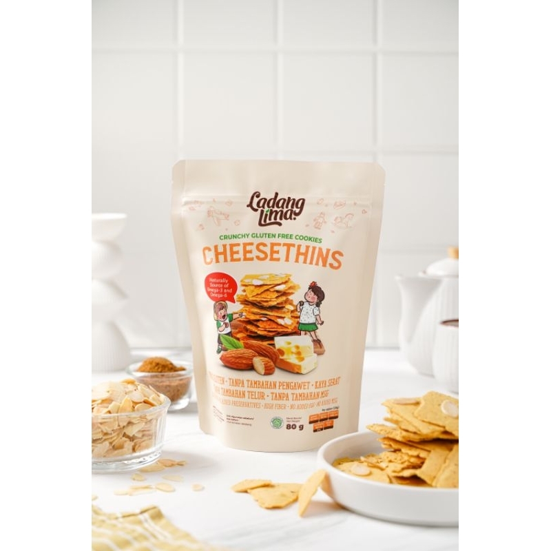 Cheesethins, kukis krispi tanpa terigu terbuat dari tepung "Ladang Lima", tepung yang berbahan singkong yang tumbuh di Indonesia, dipadu dengan taburan almond, keju, dan serpihan kelapa yang memberikan rasa gurih dan renyah, menjadikan Cheesethins sebagai pilihan kukis lezat bebas gluten yang lebih sehat dan bikin hari-hari ngemilmu makin seru.