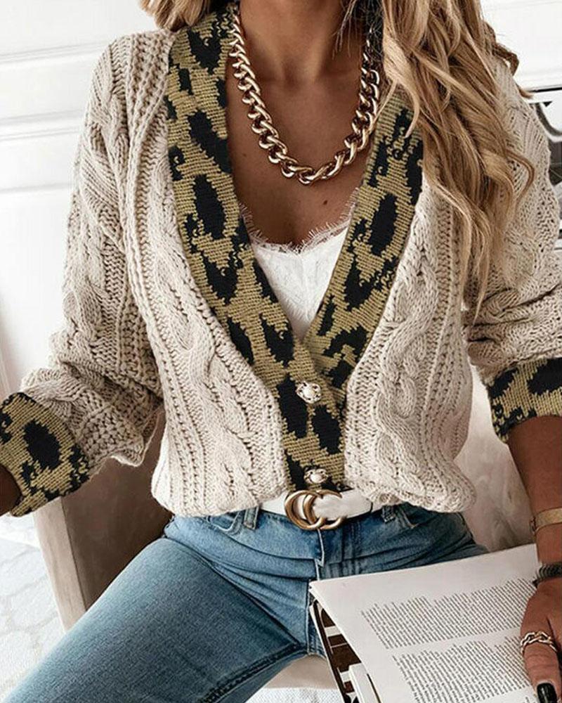 Cheetah Pattern Trim Button Front Cable Knit Cardigan, White