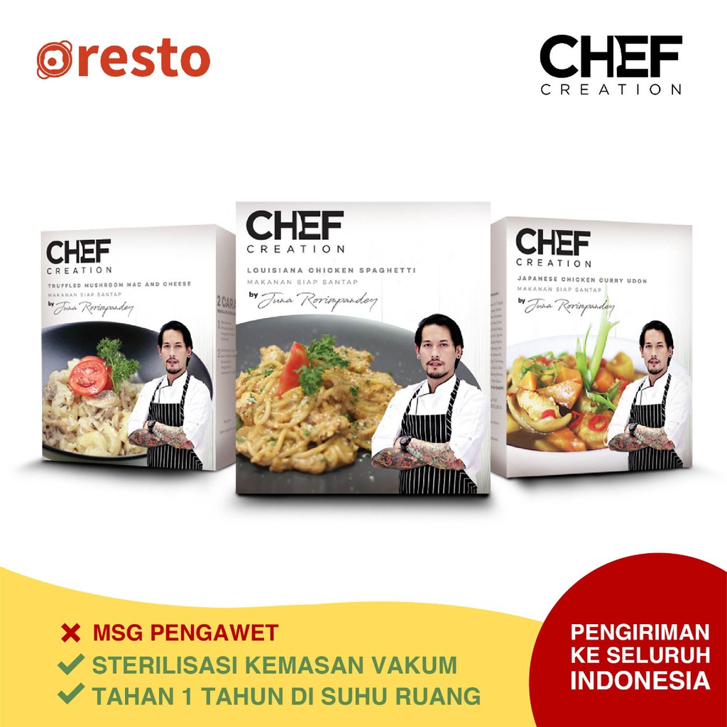 Terdiri dari 3 set ready-to-eat ala Chef Juna:- Japanese Chicken Curry Udon 325 grUdon yang dilengkapi dengan saus kari Jepang lengkap dengan daging ayam dan sayuran.- Louisiana Chicken Spaghetti Pasta 220 grPasta dengan rasa yang khas kaya akan bumbu rempah rempah lengkap dengan potongan daging ayam.- Truffled Mushroom Mac and Cheese 240 grMakaroni pasta yang dilengkapi dengan saus keju melimpah dan potongan Truffled Mushroom.Malas masak atau keluar rumah untuk beli makanan sudah bukan halangan untuk tetap makan enak!Hadir untuk kamu CHEF CREATION oleh ORESTO!Tinggal pesan online dan pesanan CHEF CREATION kamu langsung diantar ke rumah.100% HALAL DAN DAPAT DIKIRIM KE SELURUH INDONESIA!Tahan selama 12 bulan tanpa menggunakan pengawet dan MSG. ORESTO menggunakan teknik sterilisasi dan pengemasan vakum sehingga tidak akan terjadi pembusukkan ataupun perubahan rasa pada makanan kamu!Tersedia 3 pilihan cara untuk penyajian:1. Masukkan pouch ke dalam air mendidih selama 3-5 menit2. Tuang isi pouch ke atas wajan dan panaskan selama 2-3 menit3. Tuang isi pouch ke dalam wadah dan microwave selama 1-2 menitNo. P-IRT: 2063202011188-20