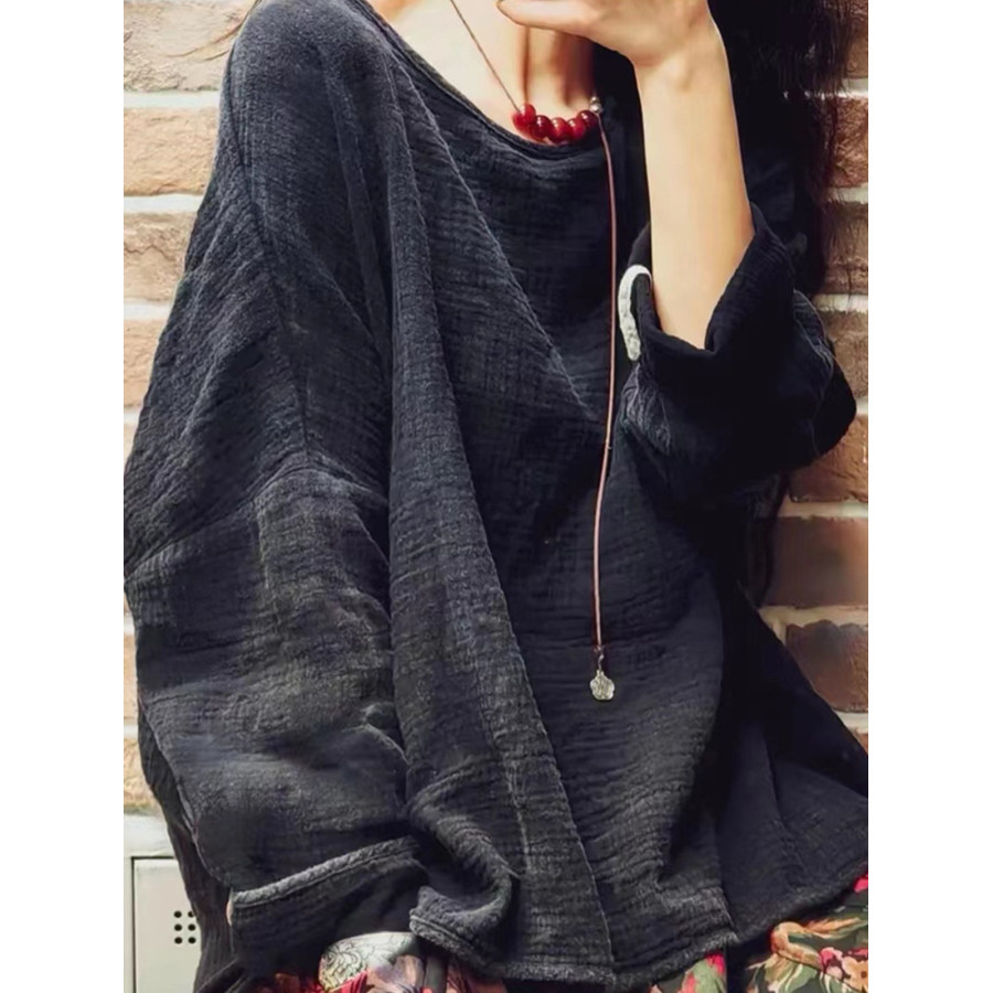 Chemisiers Décontractés En Coton Et Lin Pour Femmes Style Rétro Ample Col Rond Manches Longues