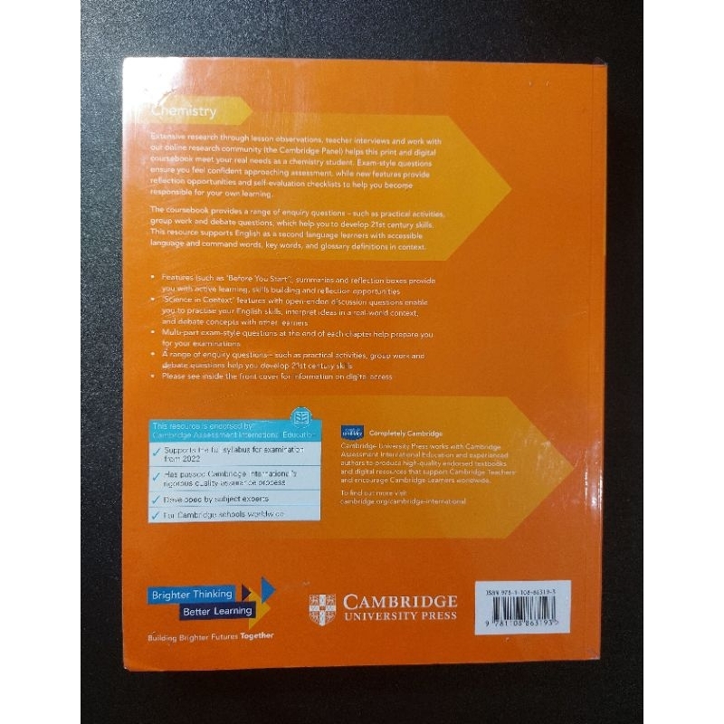 Riset ekstensif melalui observasi pelajaran, wawancara guru, dan kerja sama dengan komunitas riset kami (Cambridge Panel) berarti bahwa buku pelajaran dengan akses digital ini memenuhi kebutuhan pengajaran nyata di kelas kimia. Pertanyaan bergaya ujian memastikan siswa merasa percaya diri saat mendekati penilaian. Fitur baru memberikan kesempatan refleksi dan daftar periksa evaluasi diri mengembangkan pelajar yang bertanggung jawab. Buku kursus menyediakan berbagai pertanyaan inkuiri, seperti kegiatan praktis, kerja kelompok, dan pertanyaan debat yang mengembangkan keterampilan abad ke-21. Ini mendukung bahasa Inggris sebagai pelajar bahasa kedua dengan istilah perintah kunci, bahasa yang dapat diakses dan definisi glosarium.
