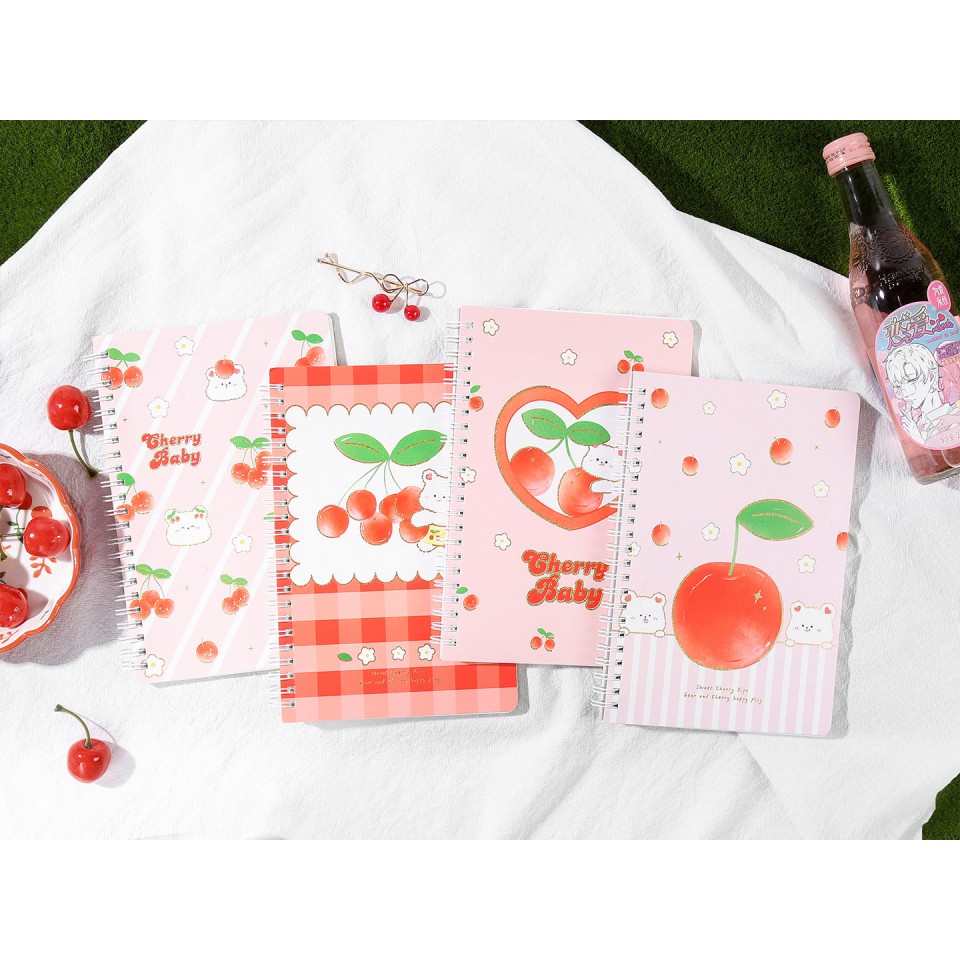 Warna merah buah ceri menghiasi sampul buku catatan Cherry Baby ini. Di atas kertas putih gadingnya kamu bisa menuliskan catatan dan semua uneg-unegmu. Buku bisa dibuka lebar berkat jilid spiralnya, jadi menulispun lebih leluasa.