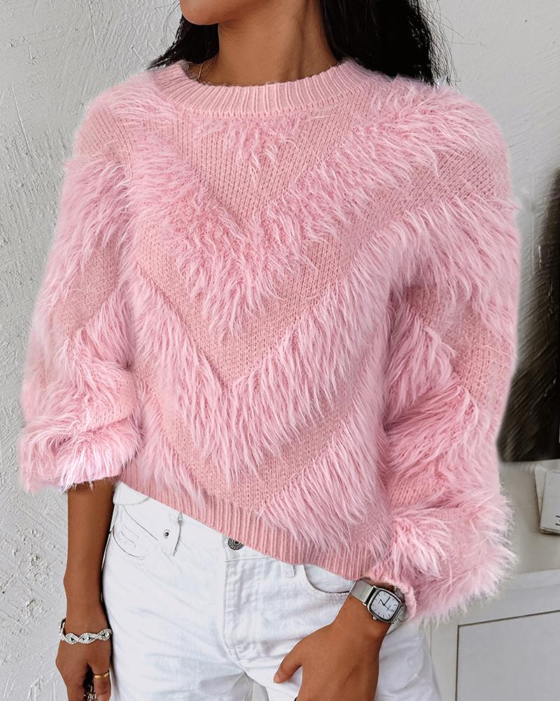 Chevron Pattern Fluffy Tassel Design Sweater, Pink