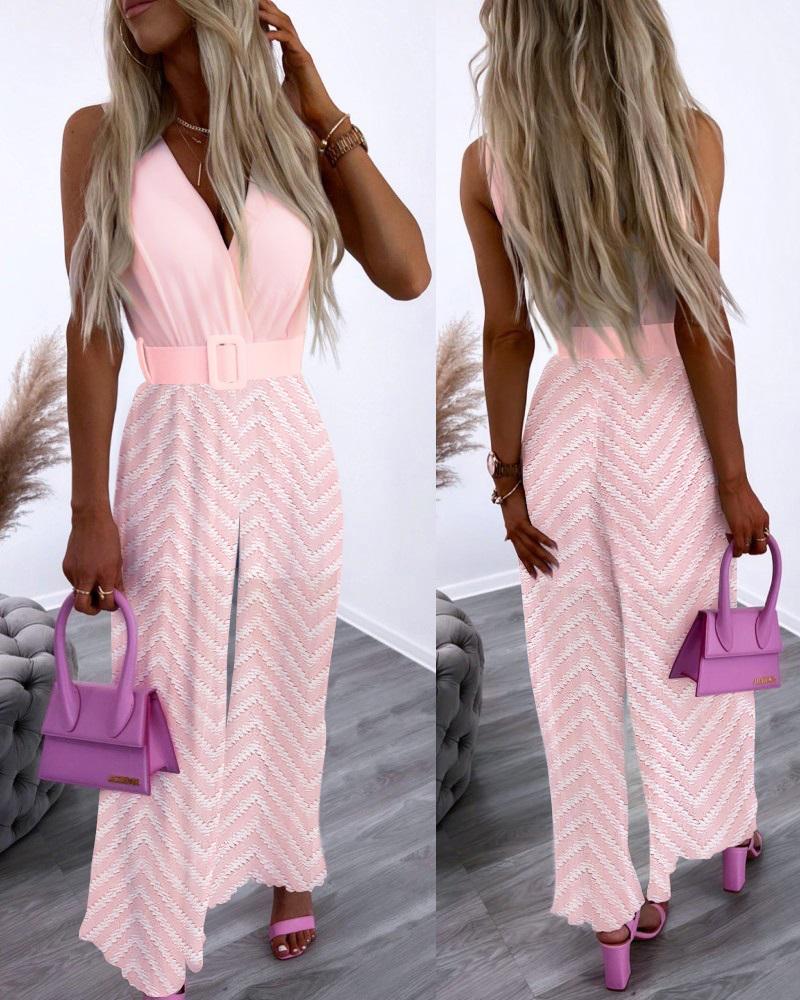 Chevron Pattern Wide Leg Ruched Jumpsuit, Pink