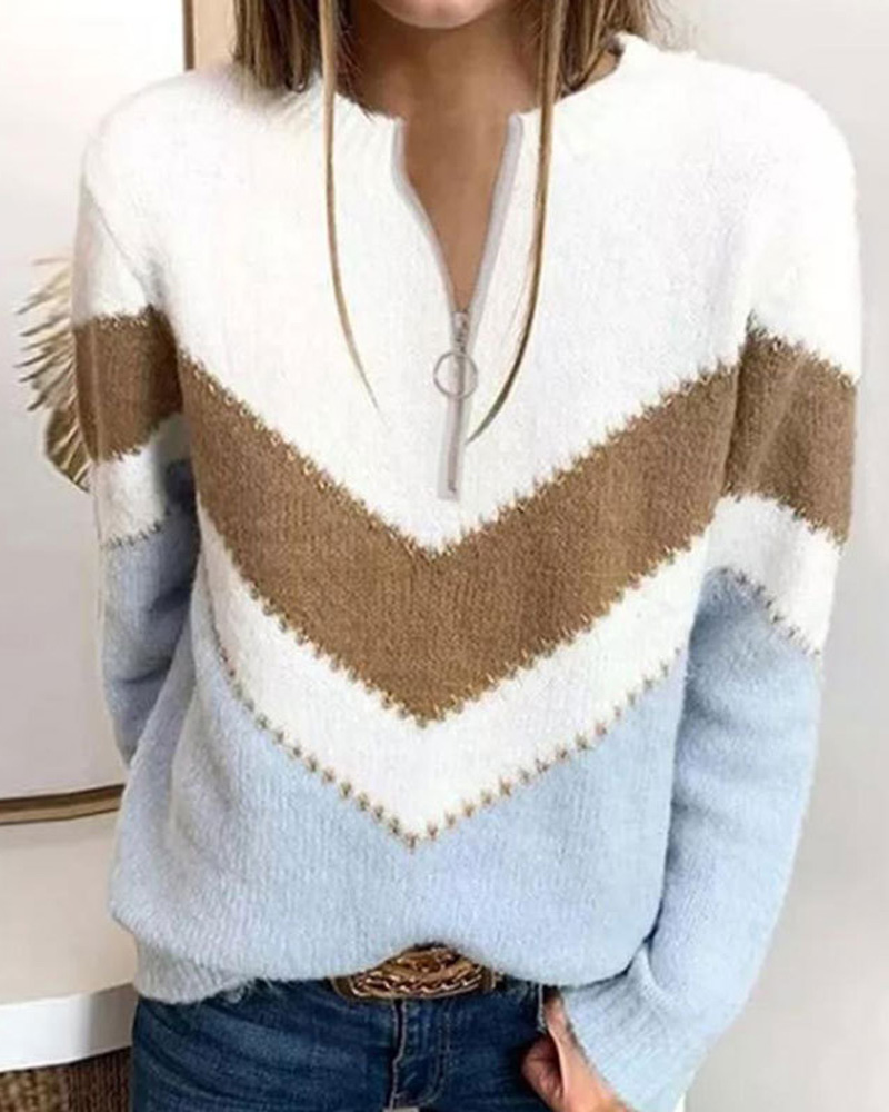 Chevron Pattern Zipper Front Sweater, Blue