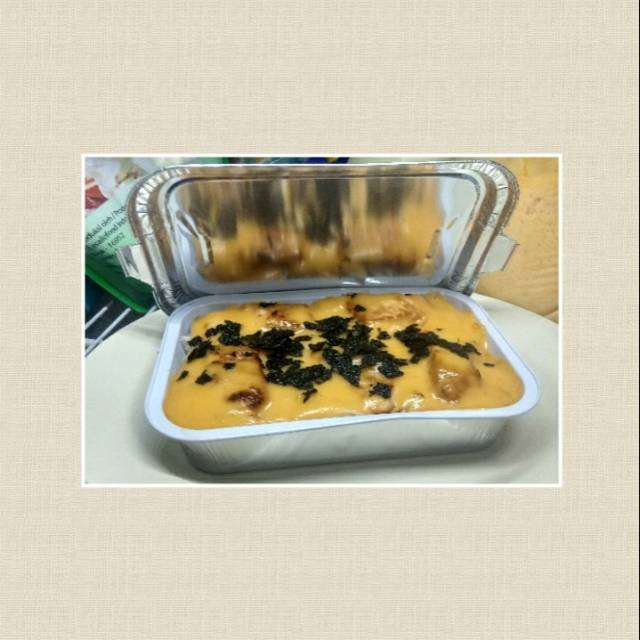 Slice daging ayam ditambah dengan nasi dengan diberi saus mentai,+ mix vegetable (wortel,jagung,kacangpolong),dan diberi taburan rumput laut