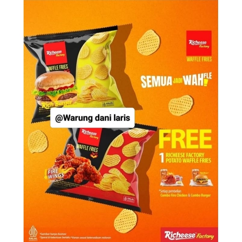 Richeese Factory Waffle Fries adalah keripik kentang berbentuk waffle dengan berbagai varian rasa, termasuk Rich Burger (rasa burger keju), Fire Wings (rasa ayam pedas), dan original.