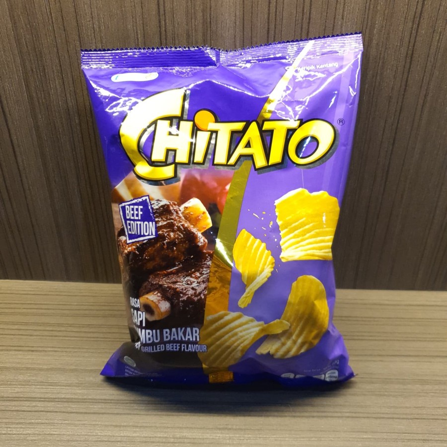 Chitato Sapi Bumbu Bakar 68g merupakan salah satu varian rasa paling populer dari keripik kentang Chitato. Terbuat dari kentang asli dengan potongan bergelombang yang hadir dalam rasa sapi panggang yang tebal dan kuat untuk memberikan pengalaman baru dalam setiap gigitannya. Keripik kentang Chitato diproses secara higienis dan modern tanpa bahan pengawet dan MSG. Juga dimasak dengan minyak alami dan sedikit garam sehingga menghasilkan keripik kentang yang sempurna, renyah dan lezat.