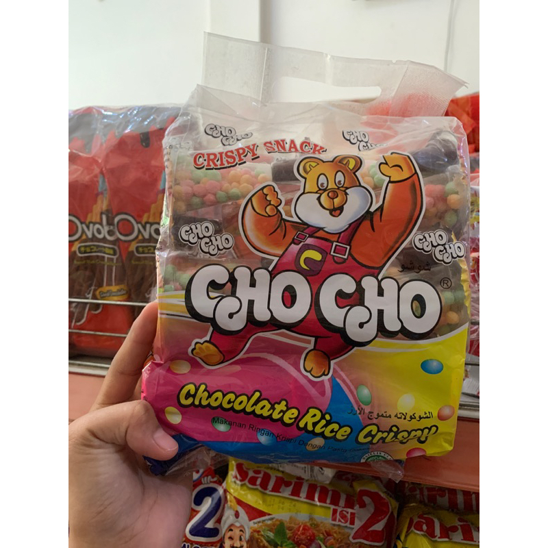 jajanan cho cho seperti nyam nyam dan ada tambahan coklat di dalam nya. isi 12 bungkus dalam 1 pak dengan berat 72g/bungkus.
