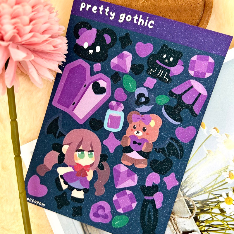 Meet Chocco and Pom dressing up for their goth days in a glittery sticker sheet, perfect for your journaling needs! Being goth does not mean we have to stop being cute