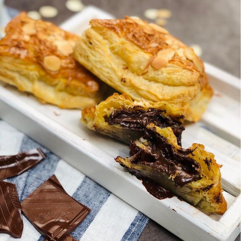 Melted Chocolate with Sliced Banana and Shredded Cheese baked on Puff Pastry Topped with sliced almonds and cheddar cheese