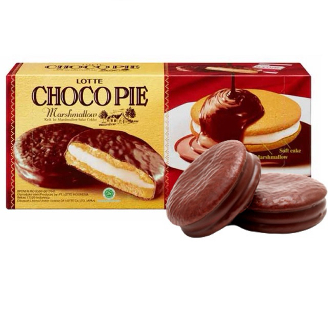 choco pie 1 box isi 12 bungkus, snack cake yang terdiri dari dua lapis kue berbentuk bulat kecil dengan isian marsmallow dan lapisan coklat yang lezat.