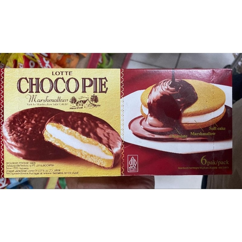 Lotte choco pie, Soft cake dengan lapis coklat dan isi marshmallow.