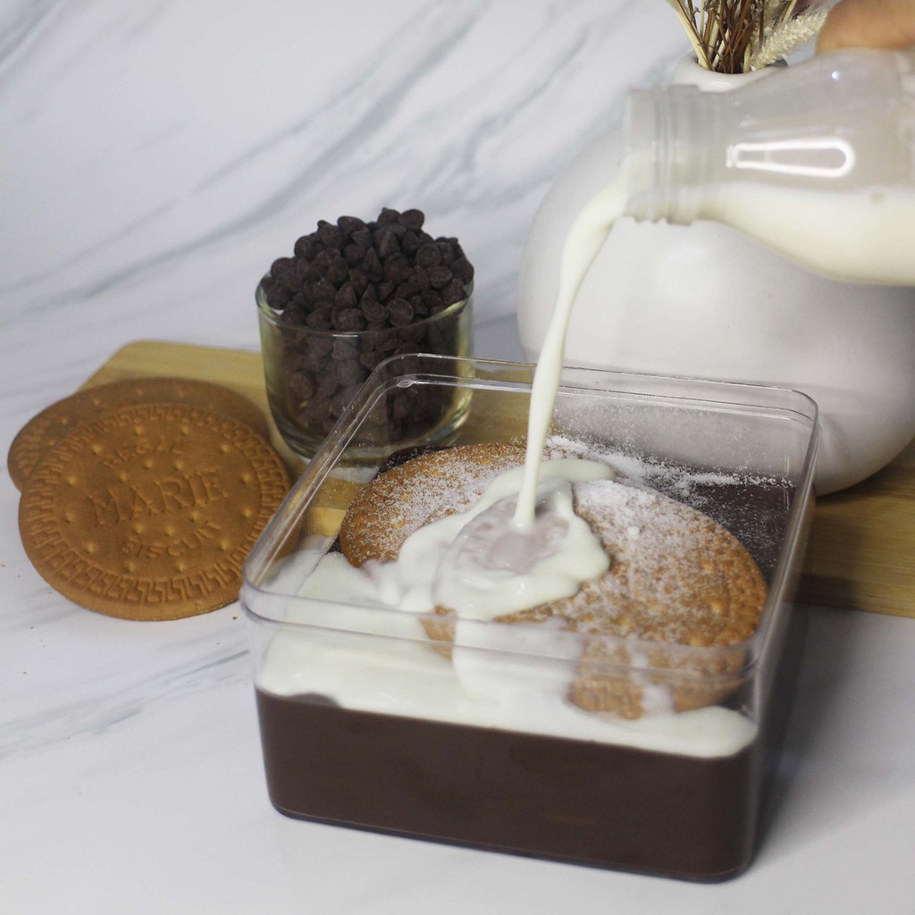 Pudding coklat dengan dua layer regal disiram dengan saus vanilla