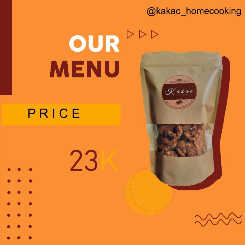 Cookie coklat kacang yang renyah dari bahan bahan premium yang pasti enak banget buat temen nyemil kamu ya.