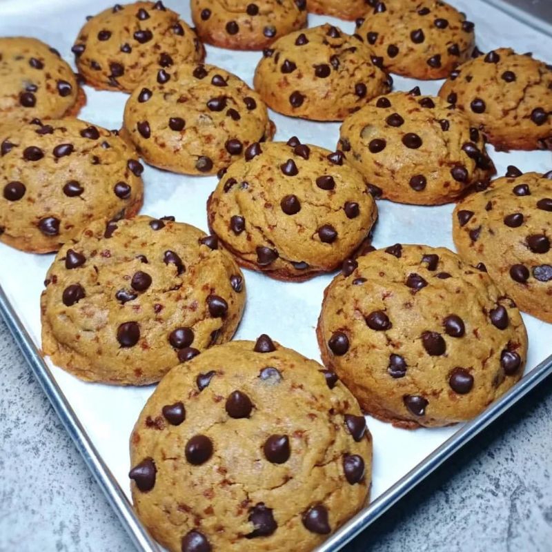 Cookies jumbo bertabur chocochip dan coklat didalam nya. Tekstur nya Empuk Chewy enaaaakk banget, Crunchy diluar chewy soft didalam. Kebayang kan enaknya