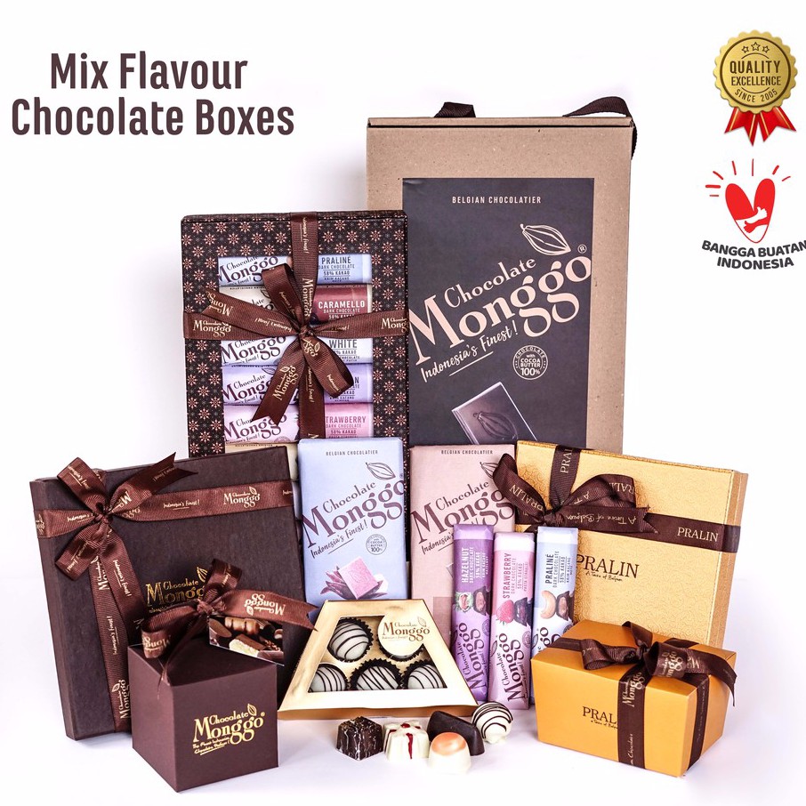 Cokelat Mix Flavor Boxes Collection Dari Chocolate Monggo. Lebih dari 30 variant, coklat sehat, manis, pahit, tanpa gula, pralines, bars, tablets,.... semua orang pasti senang dengan boxes Chocolate Monggo.