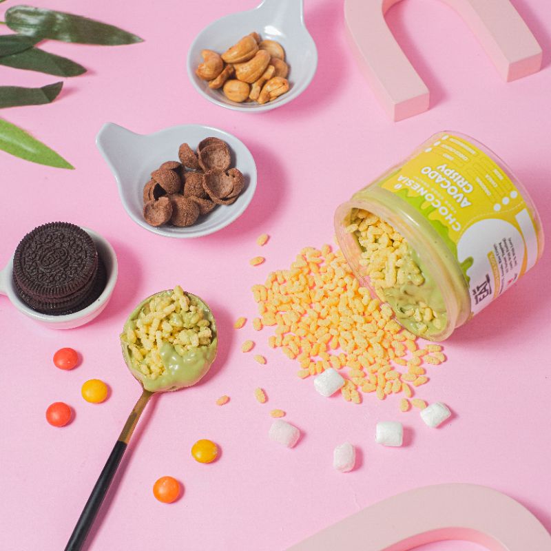 Choconesia Crispy Avocado adalah cemilan rice crispy yang dikolaborasikan dengan varian rasa avocado dan beberapa pilihan varian topping seperti original, chacha, choco crunch, marshmallow, oreo dan kacang mede.