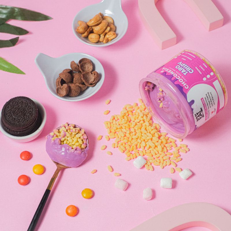 Choconesia Crispy Taro adalah cemilan rice crispy yang dikolaborasikan dengan varian rasa taro dan beberapa pilihan varian topping seperti original, chacha, choco crunch, marshmallow, oreo dan kacang mede.