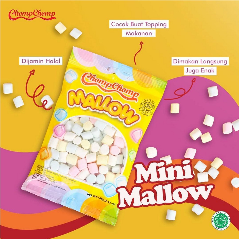 Chomp Chomp Marshmallow merupakan permen marshmallow pertama di Indonesia dengan bentuk yang unik dan nikmat, diproses secara higenis dan dikemas secara praktis. Sudah bersertifikat halal MUI.