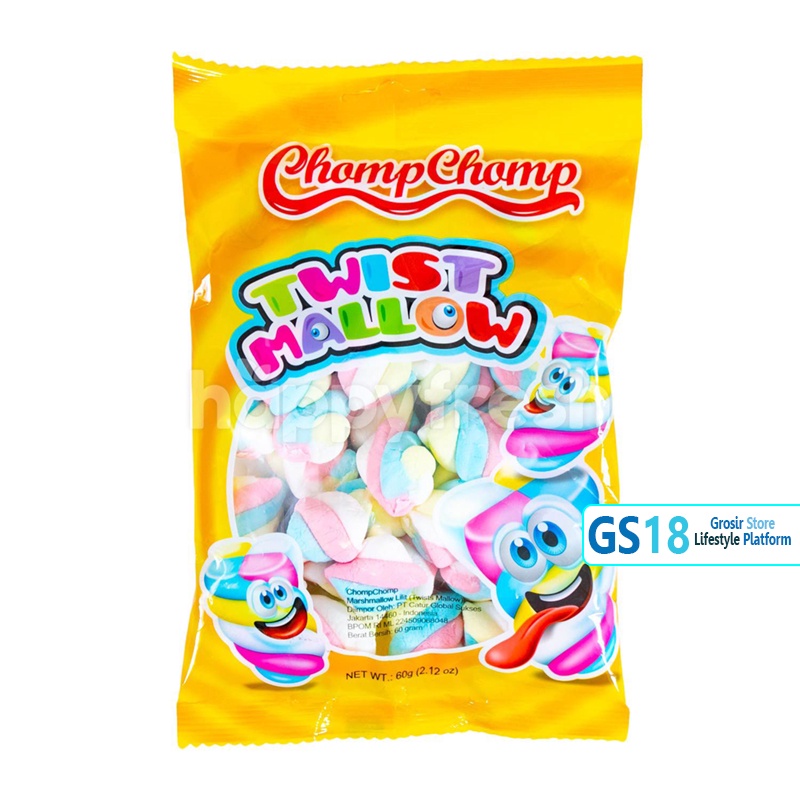 Chompshomp Marshmallow merupakan permen marshmallow rasa buah-buahan segar dengan bentuk yang unik dan nikmat yang diproses secara higenis dan dikemas secara praktis. Kemasan 60gram
