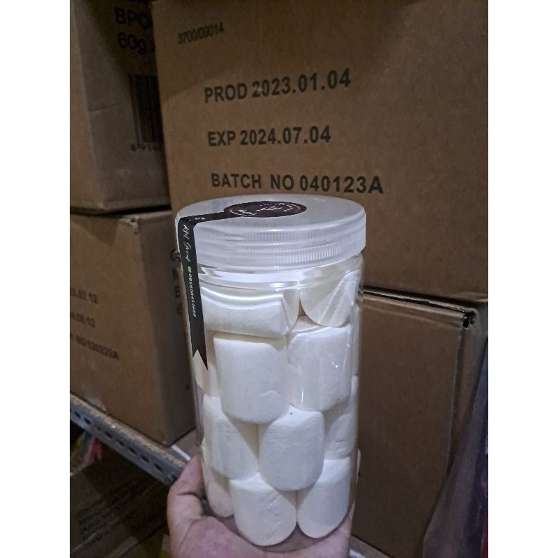 Marshmallow berbentuk Plain big dalam kemasan jar/toples bening 1000 ML.