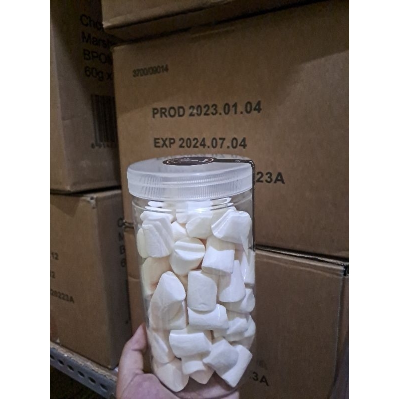 Marshmallow berbentuk Plain dalam kemasan jar/toples bening 1000 ML.