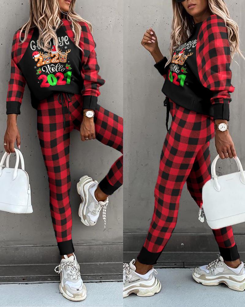 Christmas Letter Plaid Print Top & Drawstring Pants Set, Red