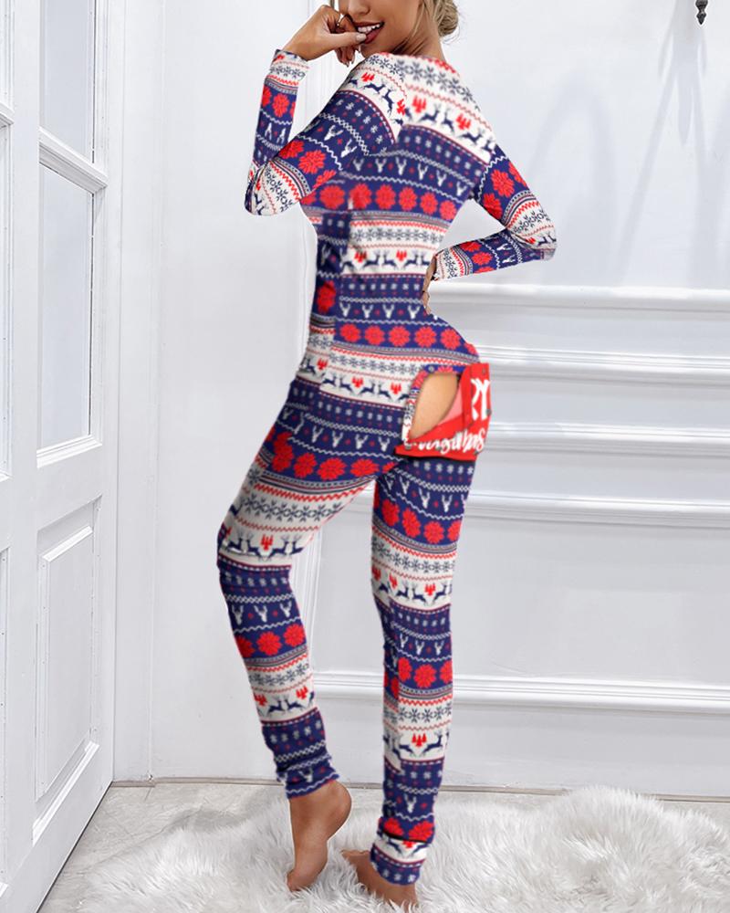 Christmas Letter Print Functional Buttoned Flap Adults Pajamas, Multicolor