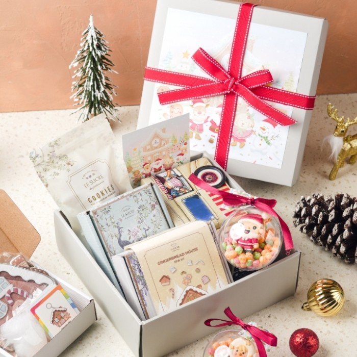 Type B : 1 truck tin can (empty), 1 sewing kit activity box, 1 raspberry choc cookies, 1 xmas theme acrylic ball, greeting card & hampers box