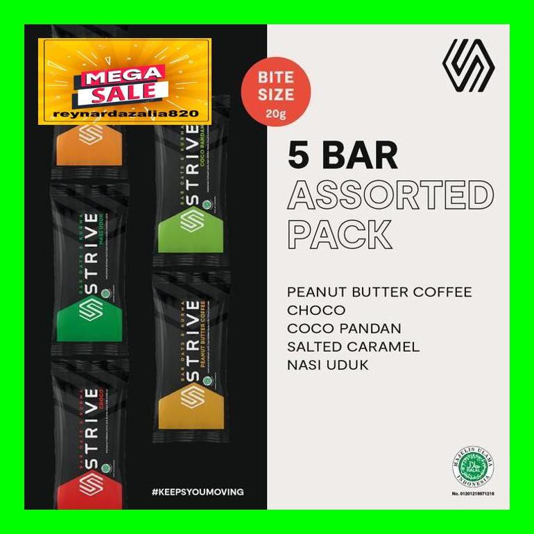 Strive padat gizi dan mengandung hampir 100 kalori. Ada 5 varian rasa, salted caramel, peanut butter coffee, choco, Nasi uduk dan coco pandan