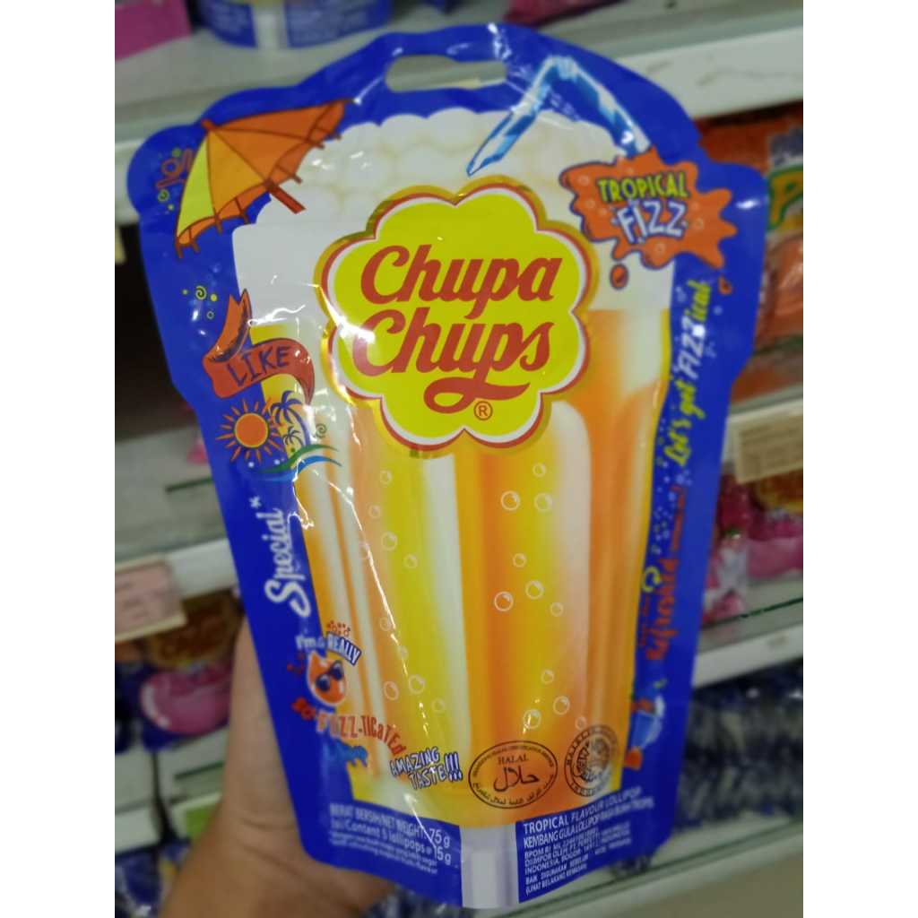 adalah permen tangkai dengan rasa buah tropikal. Dibuat dari gula pilihan berkualitas dan susu sapi murni yang dipadukan dengan calcivitia sebagai bahan dasar yang dicampur dengan krim, perisa, dan bahan bahan lainnya. Memiliki bentuk menyerupai gelas jus tropikal dengan tangkai pada bagian bawahnya, yang memudahkan orang untuk menggenggam permen tanpa perlu mengotori tangan. Dengan rasa manis dan menyegarkan dari ekstrak sari buah buahan tropikal. Permen memiliki tekstur yang keras, sehingga dapat dinikmati dengan cara diemut di dalam mulut. Cocok dijadikan cemilan saat bosan atau saat ingin menikmati sesuatu yang manis. Dengan ukuran yang kecil dan praktis, sehingga permen dapat dengan mudah diselipkan di dalam tas atau kantung celana. Dikemas dalam kemasan pouch isi 5 tangkai permen. Segera miliki Chupa Chups Permen Lolipop Tropical Fizz 5 x 15 g dan rasakan sensasi segar manis yang unik.