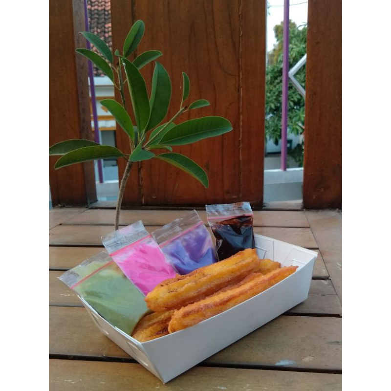 Churros aneka rasa saus serta taburan gula halus dan coklat bubuk.